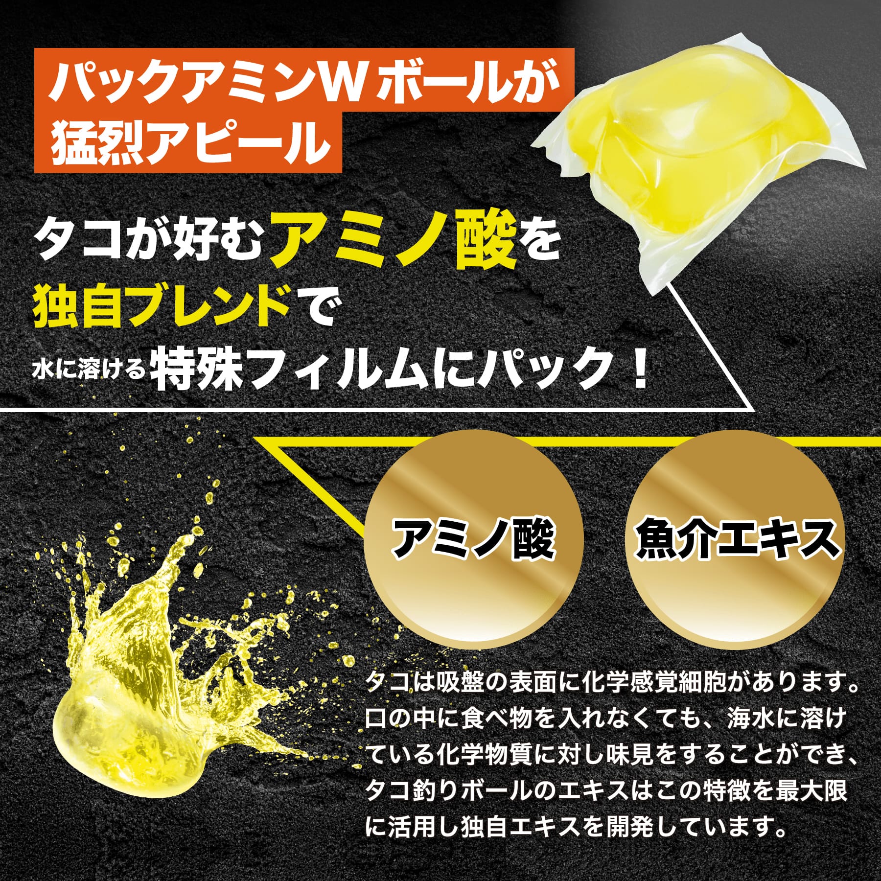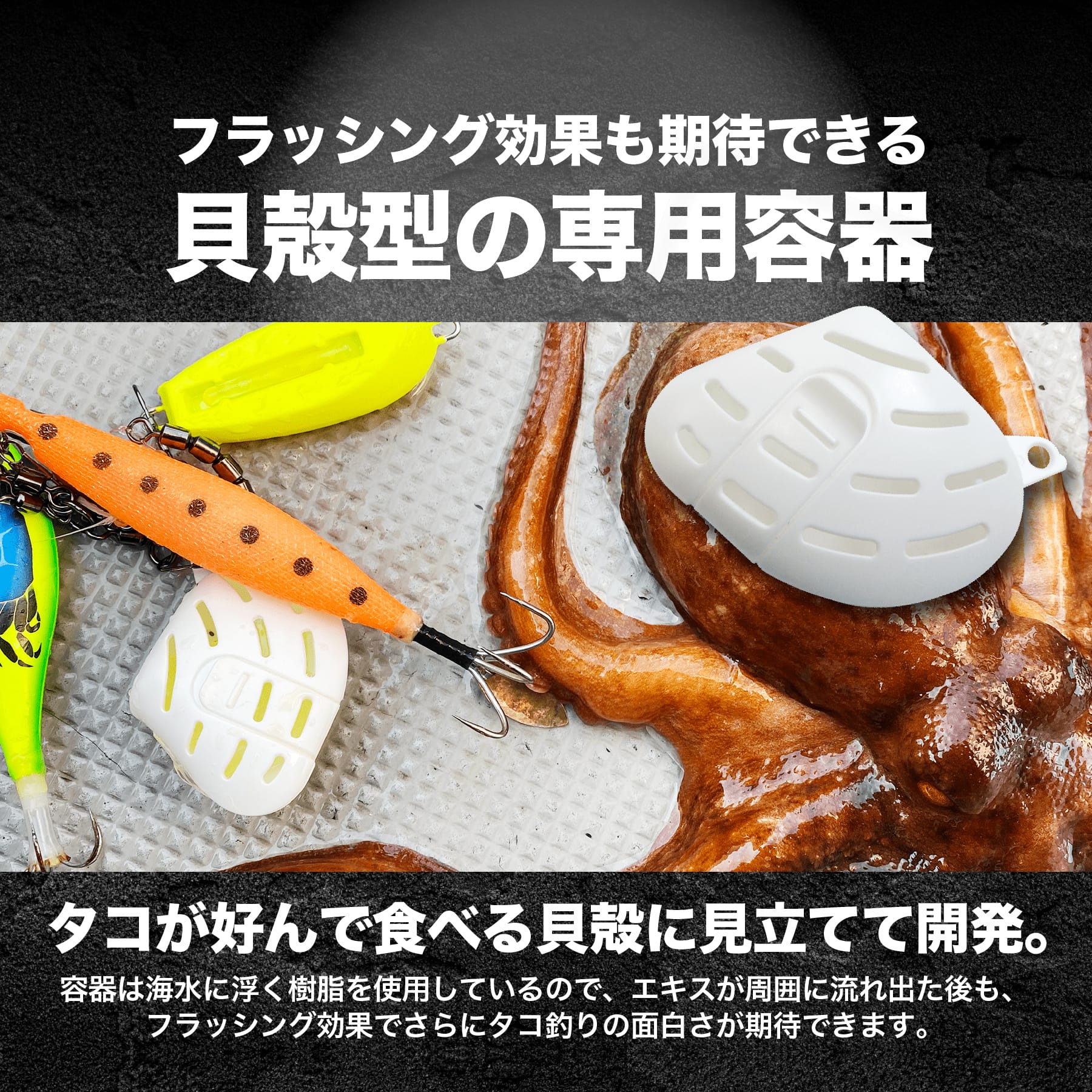 タコが好むアミノ酸や魚介エキスを独自ブレンドしたオリジナルエキスを水に溶ける特殊フィルムで大物タコ狙い エギ オモリをプラス使用。