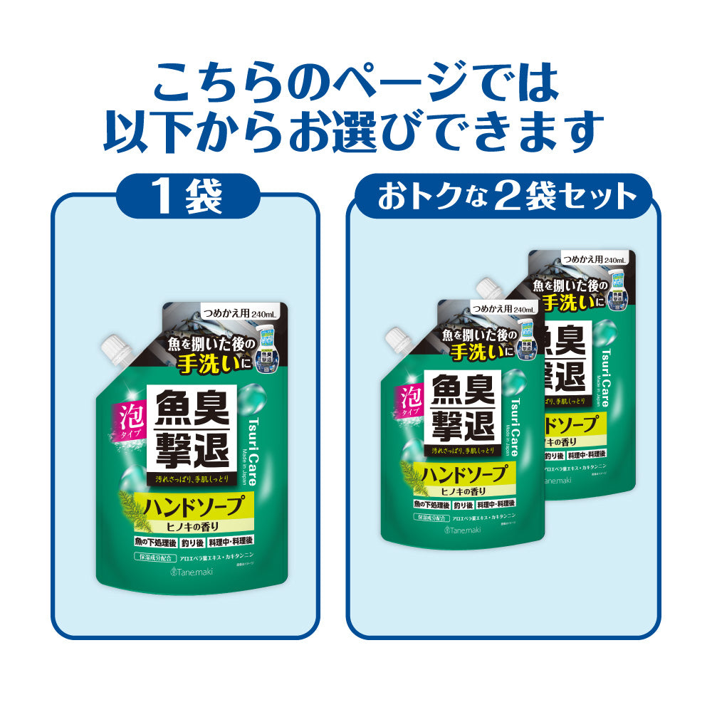 【親の説明】魚を触った後の手洗いに最適!魚の脂や魚臭をさっぱり洗い落とします。アロエベラ葉エキス・カキタンニン配合 (保湿剤)で、手肌にうるおいを与えます。泡で出るヒノキの香りのハンドソープnew の詰め替え商品です。
