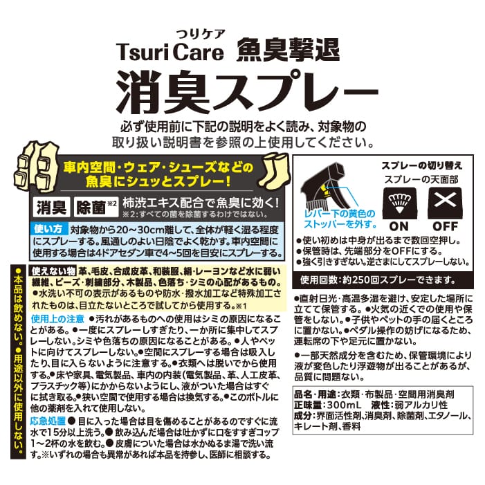 | 品名 | 魚臭撃退 消臭スプレー (商品名:つりケア 魚臭撃退 消臭スプレー ) |