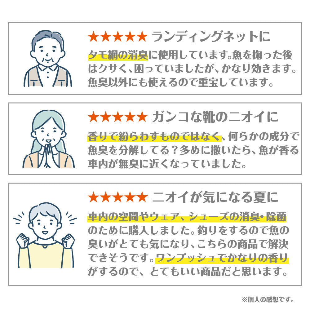 ・車内空間・ウェア・シューズなどから臭う魚臭にシュッとスプレーして消臭。